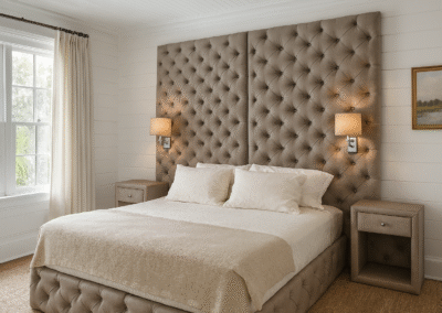Zagłówek o imponującej wysokości to nie tylko ozdoba – zapewnia również wygodne podparcie podczas relaksu. Subtelne detale i symetryczna forma sprawiają, że to łóżko tapicerowane z zagłówkiem przyciąga wzrok i tworzy przytulną atmosferę w sypialni.