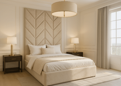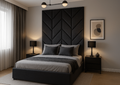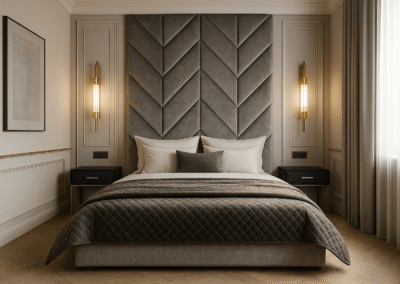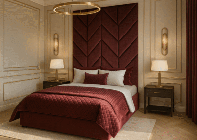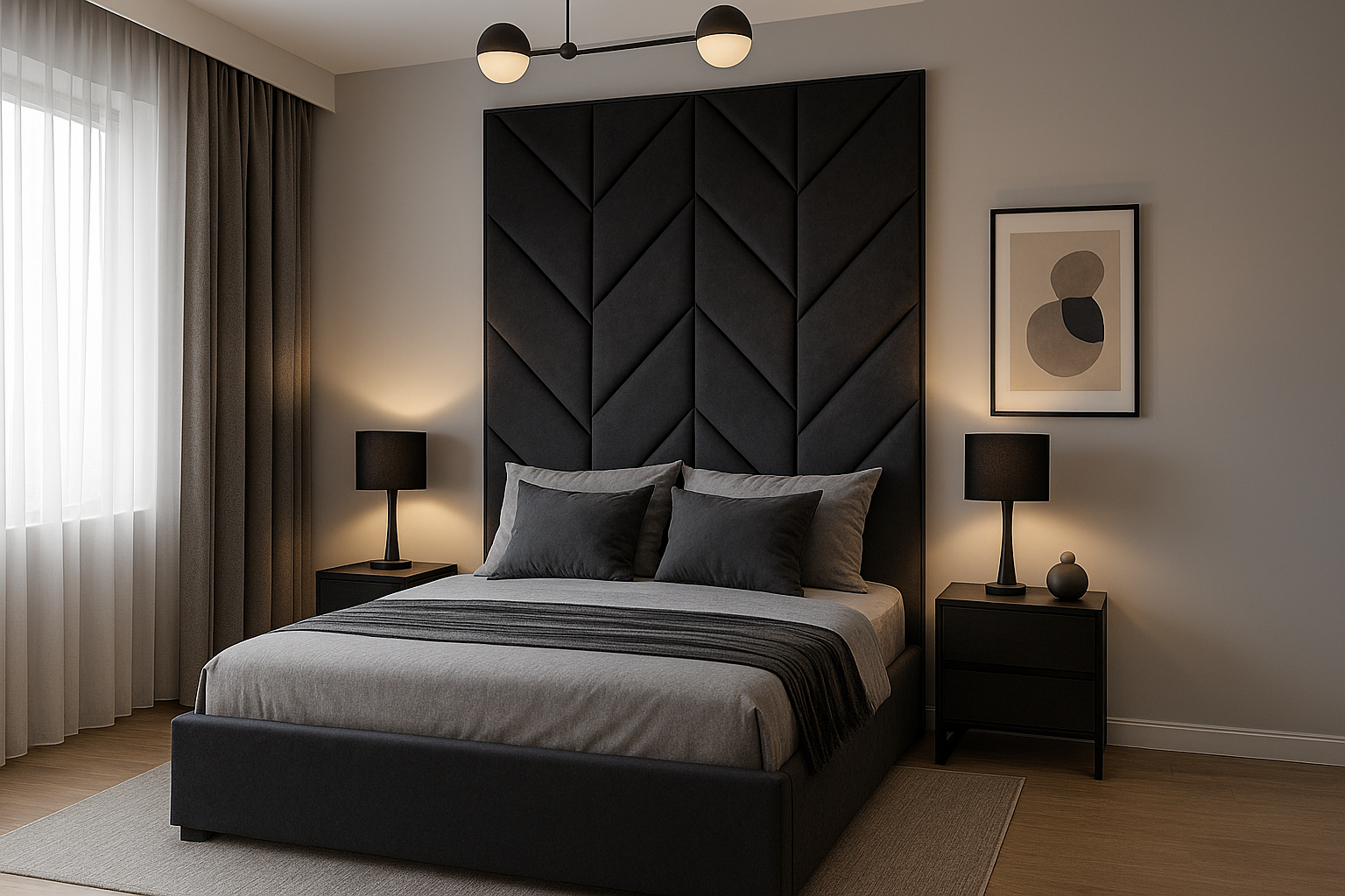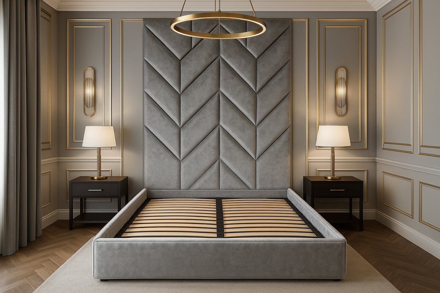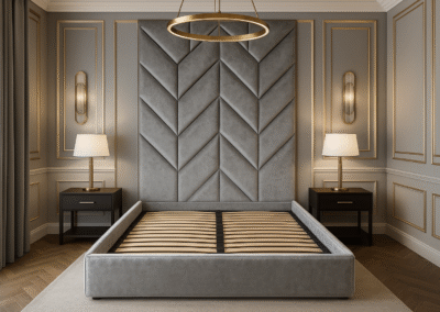 Wprowadź elegancję i nowoczesność do swojej sypialni dzięki naszemu ekskluzywnemu łóżku tapicerowanemu. Model ten charakteryzuje się wysokim, miękkim zagłówkiem o unikalnym wzorze w jodełkę, który dodaje wnętrzu klasy i głębi. Całość wykonana została z wysokiej jakości welurowej tkaniny, która pięknie odbija światło, tworząc luksusowy efekt.